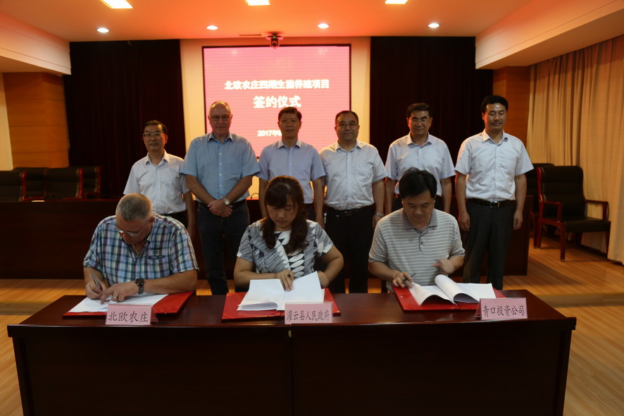87日下午,北歐農莊四期生豬養殖項目簽約儀式在灌云縣行政中心舉行。集團公司領導楊龍、胡建明、陳如軍,灌云縣領導朱興波、王慶嘉、張凌云,丹育公司董事勞倫斯·桑德高,連云港北歐農莊生豬養殖有限公司首席執行官楊林柏等出席簽約儀式。