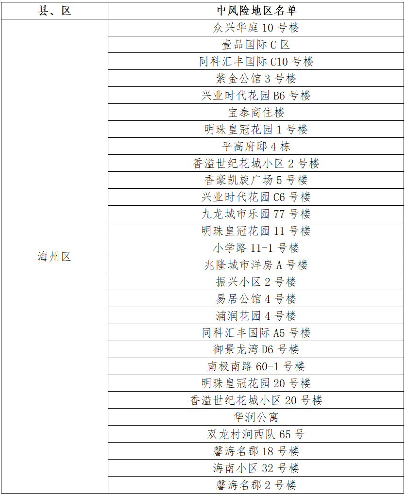 根據(jù)國務(wù)院聯(lián)防聯(lián)控機(jī)制有關(guān)規(guī)定,經(jīng)市指揮部研究決定,自發(fā)布之日起,對我市部分區(qū)域疫情風(fēng)險等級進(jìn)行調(diào)整:海州區(qū)天順國際花園7號樓、鳳凰名都10號樓、御景龍灣C1號樓、天順國際花園11號樓、御景龍灣A4號樓、香溢江南小區(qū)12號樓、同科匯豐國際A2號樓、平高書香名邸1號樓、香溢江南小區(qū)7號樓、西門村楊鳳莊21號、鳳凰名都9號樓、園林村白虎山小區(qū)78號樓、江化北路82-5號、金色大漠、平高書香名邸4號樓、朐陽街道花園路1號、制藥巷5-114、萬潤泰和苑4號樓由中風(fēng)險地區(qū)調(diào)整為低風(fēng)險地區(qū)。其他地區(qū)風(fēng)險等級不變。調(diào)整后全市現(xiàn)有28個中風(fēng)險地區(qū)。