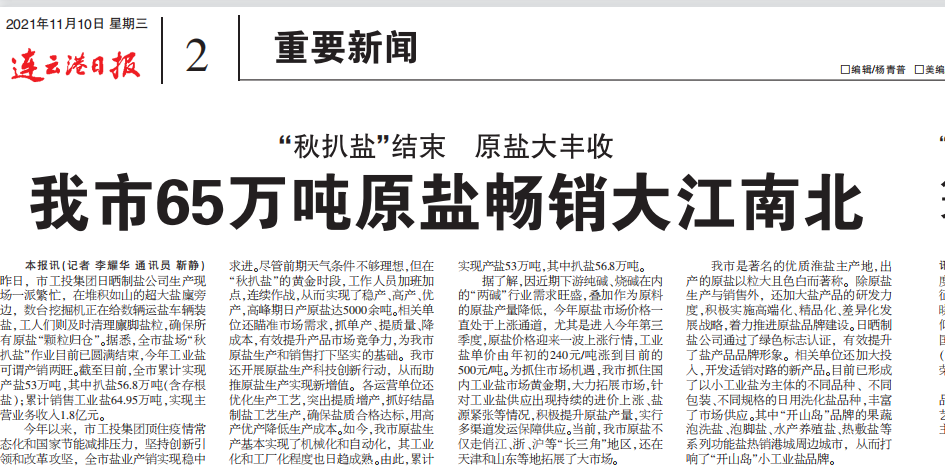連云港日報刊登:我市65萬噸原鹽暢銷大江南北
