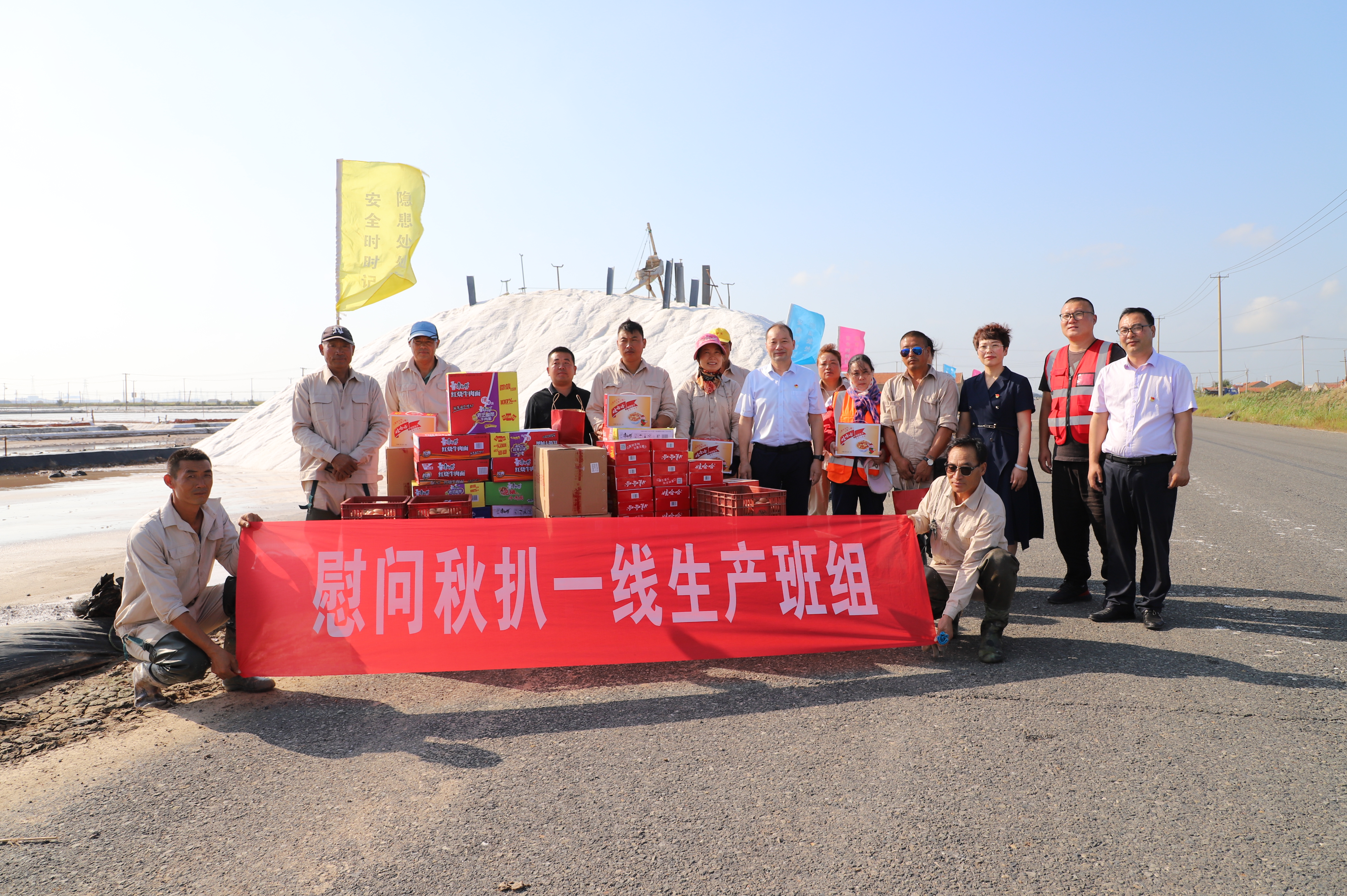 投資公司領導來到新河二班與埒南九班,對他們的工作表示肯定,要求一線職工在做好工作的同時一定要注意生產安全,保證職工安全和身體健康。同時給堅守在扒鹽一線的工人送上了誠摯的問候,對他們的辛勤勞動表示感謝,為他們送上了月餅、雞蛋、八寶粥、方便面等物品。