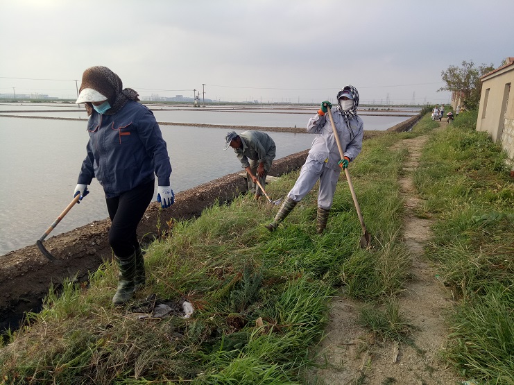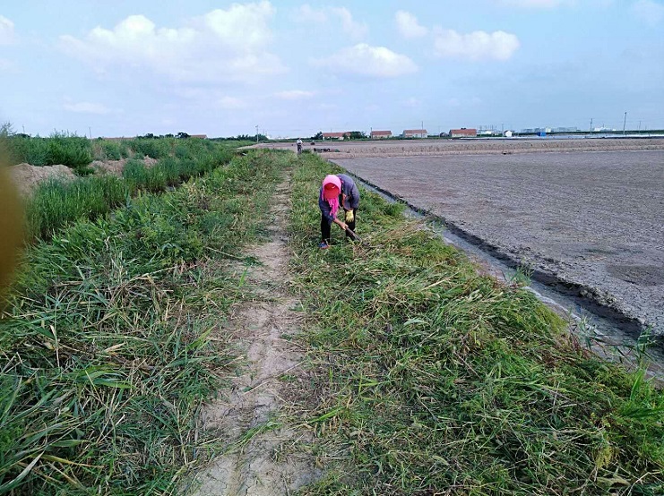 近日,實業公司海鹽基地,柴門區三個班組加緊對灘場進行除草行動。夏日雜草叢生,嚴重影響灘容灘貌,且對灘格、溝道等造成制鹵障礙,各班組長帶領工人緊抓時間、人機結合除草。截止今日,三個班組共除草九千余米。(實業公司)