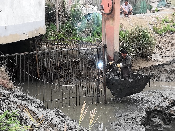 由于小站河道長期未清理,淤泥和廢棄物的堆積,對小站機泵打水造成阻礙,降低了機泵打水速度,造成耗時增長、耗電量增加,嚴重影響了小站閘工的工作效率。因此資源公司動用兩臺挖掘機對小站河道進行了扒淤和廢棄物清理工作,并增設自制潮檔阻擋廢棄物進入機泵附近,防止廢棄物纏上機泵的水葉,對機泵造成損傷。