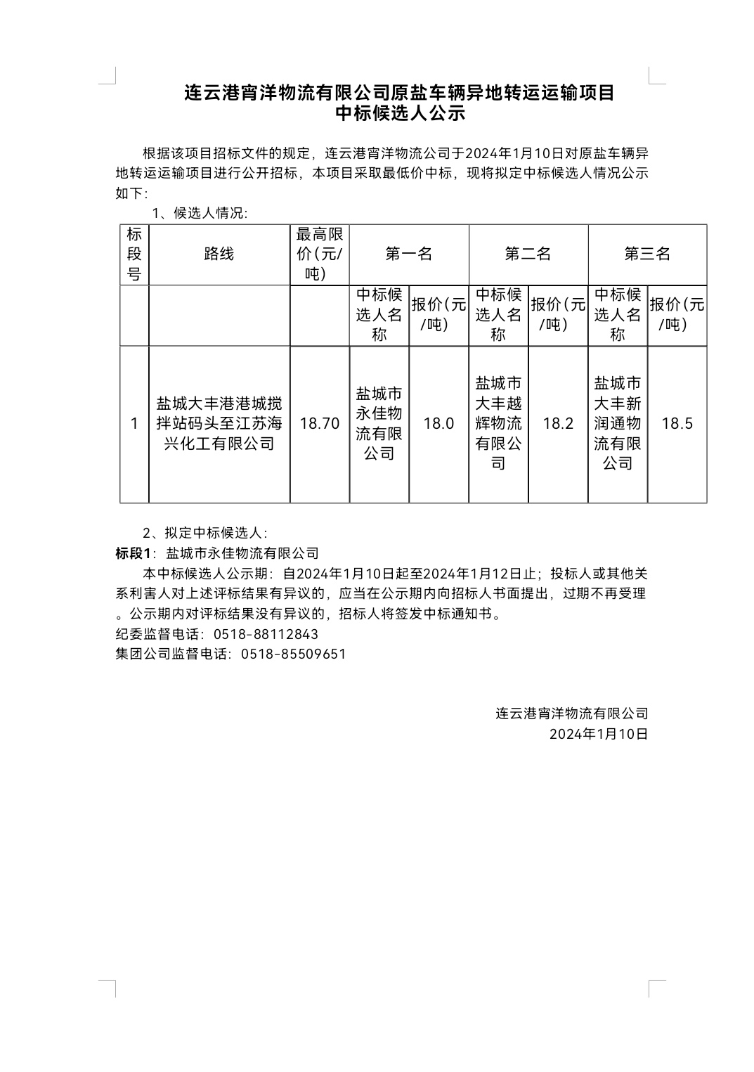連云港宵洋物流有限公司原鹽車(chē)輛異地轉(zhuǎn)運(yùn)運(yùn)輸項(xiàng)目中標(biāo)候選人公示