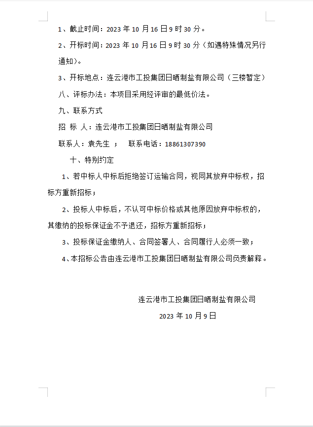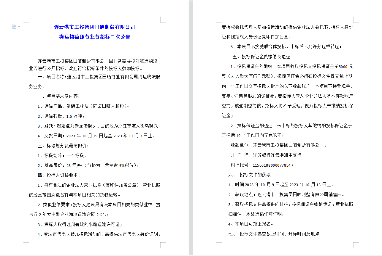 連云港市工投集團日曬制鹽有限公司 海運物流服務業(yè)務招標二次公告