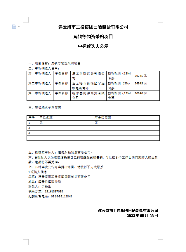 連云港市工投集團日曬制鹽有限公司角鐵等物資采購項目中標候選人公示