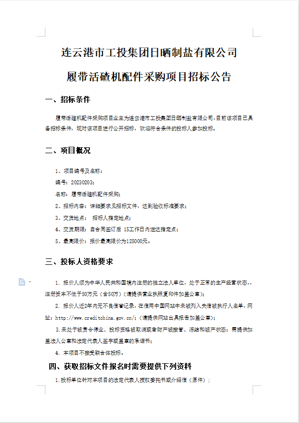 連云港市工投集團日曬制鹽有限公司履帶活碴機配件采購項目招標公告