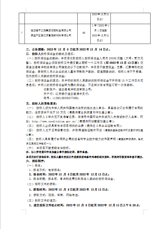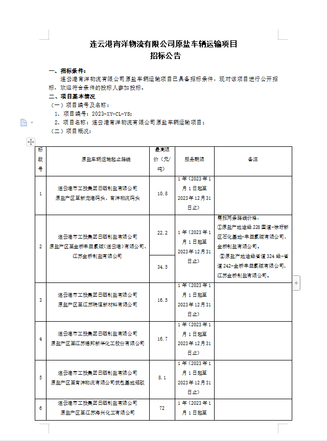 連云港宵洋物流有限公司原鹽車輛運(yùn)輸項目招標(biāo)公告
