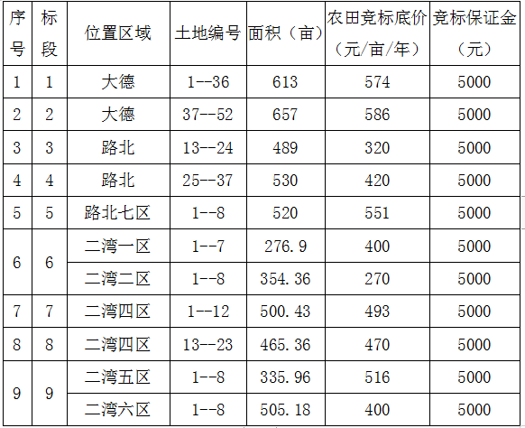 一、競(jìng)標(biāo)農(nóng)田標(biāo)段、位置、面積、競(jìng)標(biāo)底價(jià)、競(jìng)標(biāo)保證金:
