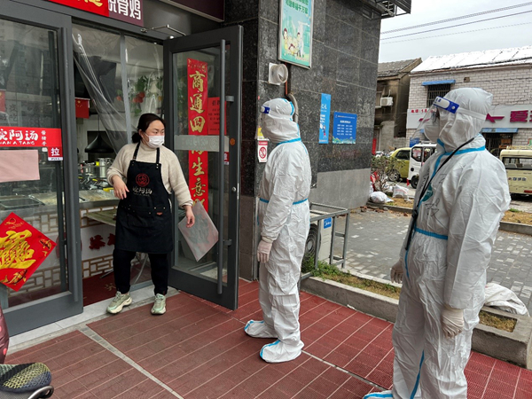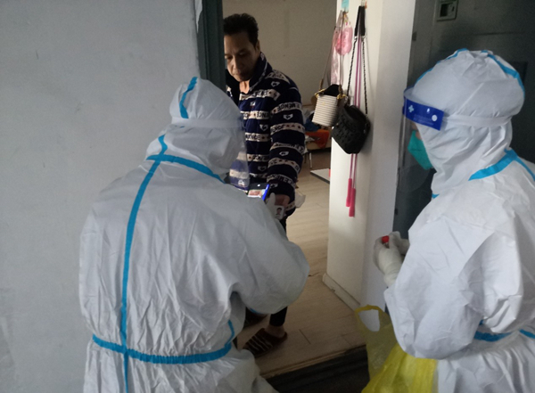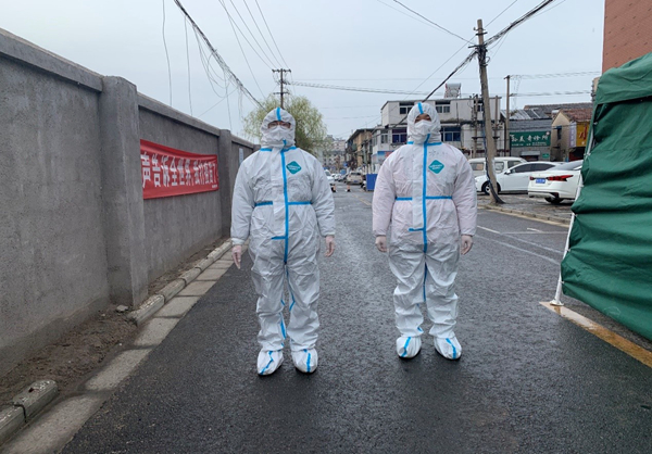 公司員工范益楊、李夢達(dá)是集團(tuán)抗疫志愿隊的隊員。在冷冽寒風(fēng)中,他倆身穿防護(hù)服挨家挨戶通知商戶暫停營業(yè),同樣的通知話語不厭其煩的重復(fù)著一遍又一遍,說得口干舌燥、疲憊不堪也未能阻攔他們繼續(xù)前進(jìn)的腳步。