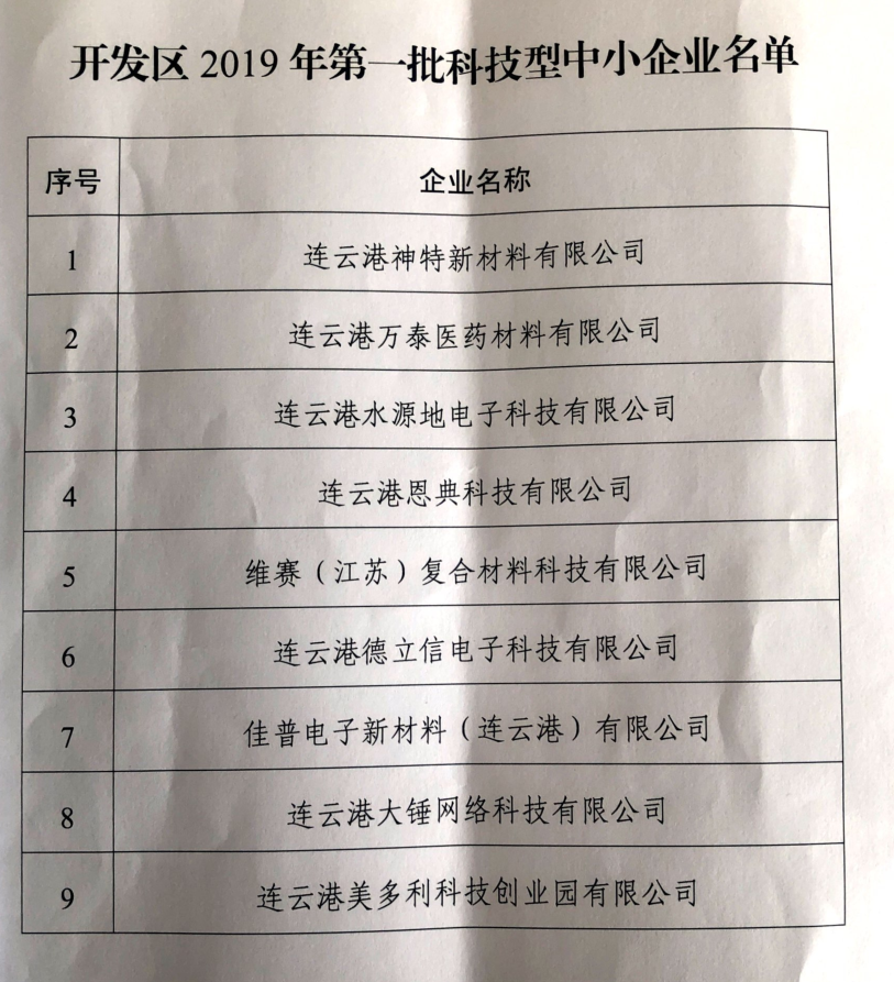近日,公司被經濟技術開發區管委會認定為“2019年第一批科技型中小型企業”。