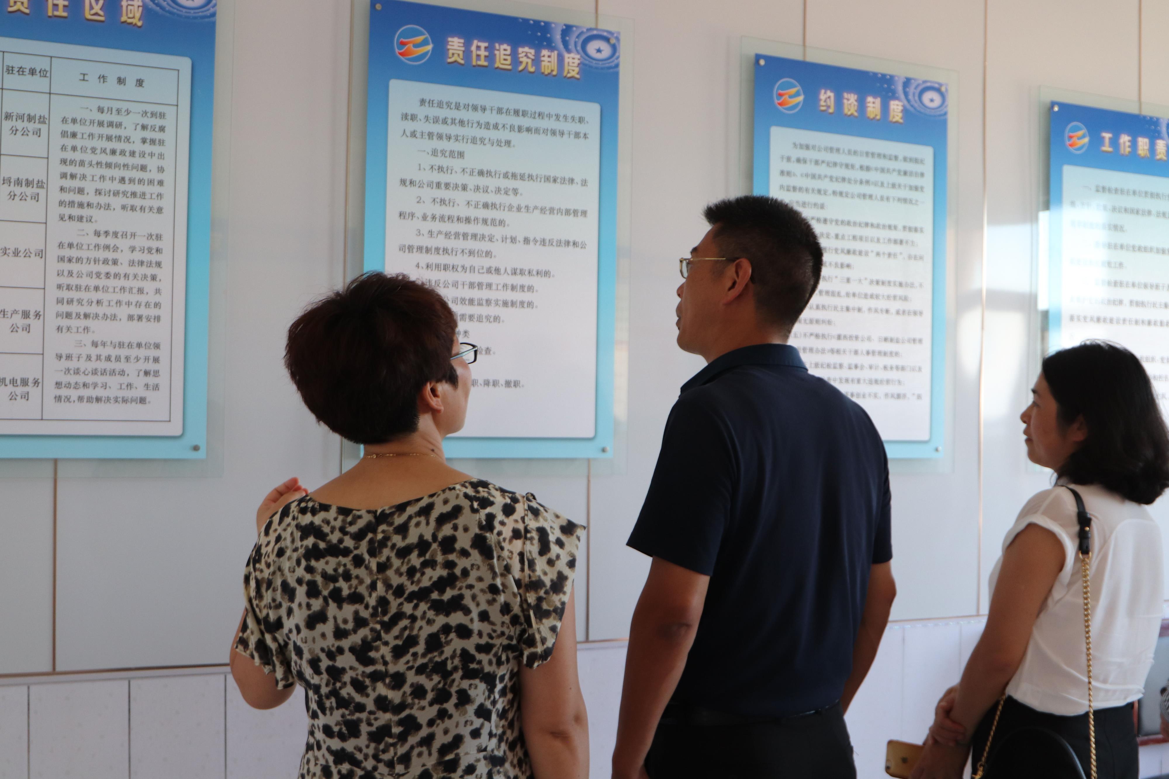 7月31日下午,神特公司與奧神新材料公司兩家紀檢干部結(jié)伴同行,前往灌西投資公司參觀學(xué)習(xí)。在灌西投資公司紀委書記王宏的陪同下,神特公司和奧神公司的紀檢人員參加了灌西投資公司經(jīng)營單位片區(qū)第二季度黨風(fēng)廉政發(fā)布會,聽取了二季度黨風(fēng)廉政建設(shè)情況,隨后觀摩了新河、埒南、西旺等支部黨建活動室,日曬制鹽片區(qū)、灌西經(jīng)營單位片區(qū)兩個派駐基層監(jiān)察室,查看了紀檢工作臺賬,并一同觀看了廉政微電影《鹽光》。