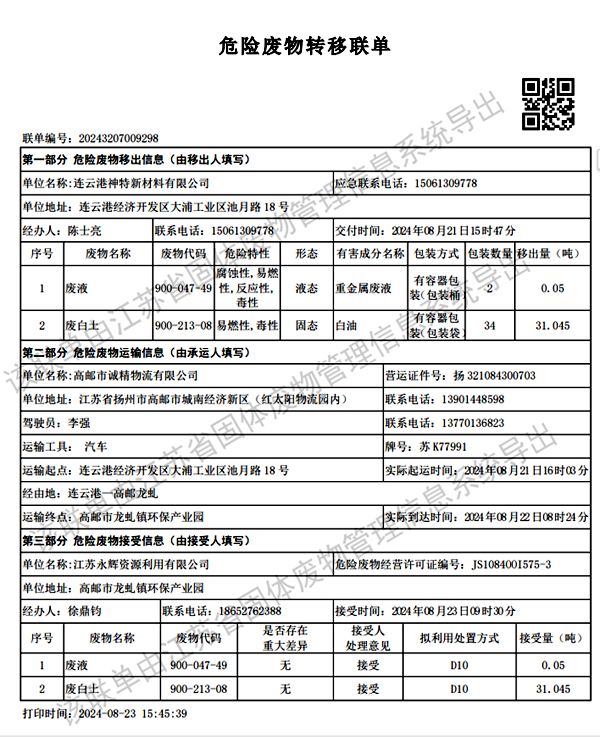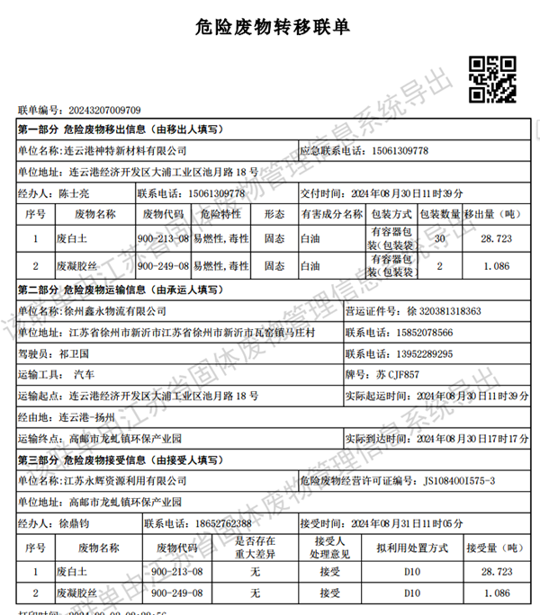 神特公司2024年第三季度危廢處置情況公示