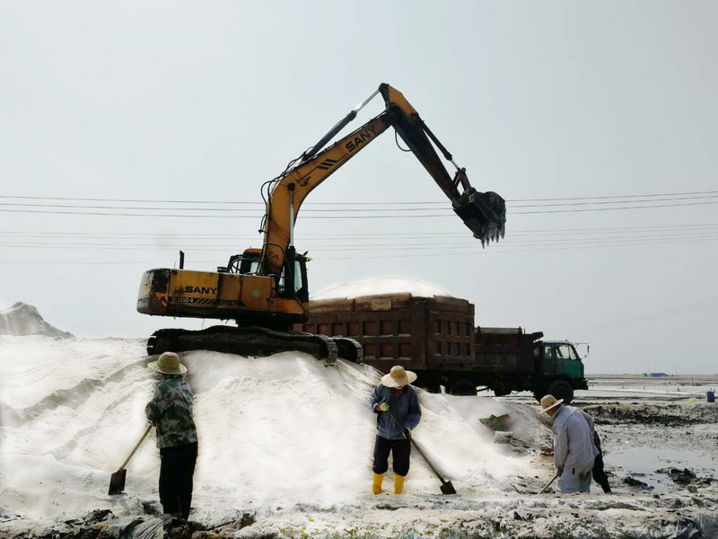 在大浦工區,工長劉天義說:“今年秋扒的任務重,加之最近幾天陰雨,耽誤了工期,國慶期間我們全部放棄休假,今天早上收完塑苫布,只要天氣允許,我們馬上就轉入正常扒鹽工作.....