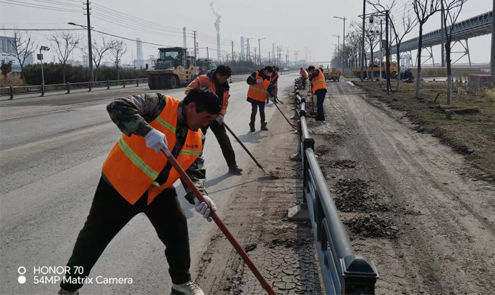 3月15日,該分公司近15余名黨員突擊隊員,在黨支部號召下,無視春光照曬、三人一組、兩個一對、揮動手中鐵銑,無懼泥土揚塵四起,清除蘇海路,港前卡口護欄下車輛拋灑泥土2000多米長,人工清掃護欄內石子30多處,車輛轉運20多車。黨員陳小軍、陳海彬等同志盡管手磨破了,仍然堅守道路最前沿,經過30余名隊員兩天持續奮戰,整潔靚麗的路面再次展現石化園區。