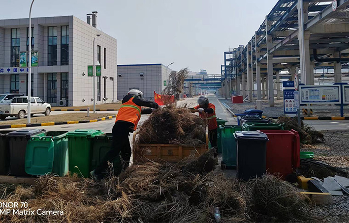 為營造石化園區(qū)內(nèi)部優(yōu)美整潔靚麗環(huán)境,保潔分公司聞令而動,第一時間趕赴中化倉儲公司院內(nèi),高質(zhì)高效完成突擊清理任務而努力奮戰(zhàn)。