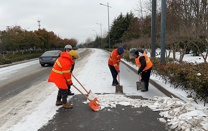 雪花紛飛,寒風凜冽,板橋工業園區內,除雪車、雪輥車等機械設備齊上陣,采取機械化與人工除雪相結合的方式,雪鍬、掃帚齊上陣,大家你鏟我除、干勁十足,以最快的速度清除板橋園區云港路、祥和路、瑞和路等交叉路口、重要地段冰凍積雪。