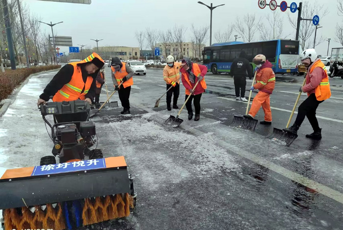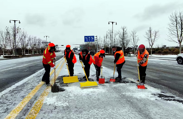 ? ? ? ?連日來,受強冷空氣影響,鵝毛雪花持續飄落港城大地。為保障行人車輛往來徐圩新城安全通行。保潔分公司全員上下協力同心、“遇雪”奮戰,確保責任區域道路車輛行人安全出行。