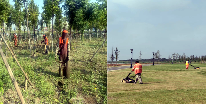 早上6:30,班組兵分三路。班長田恒亮帶領(lǐng)一組工人用草坪機(jī)修理草坪;協(xié)管員葛成東帶另一組工人用割灌機(jī)清除雜草;對于不便用機(jī)器清除的區(qū)域,第三組工作人員采取用手拔除方法,確保各區(qū)域雜草清理不留死角。
